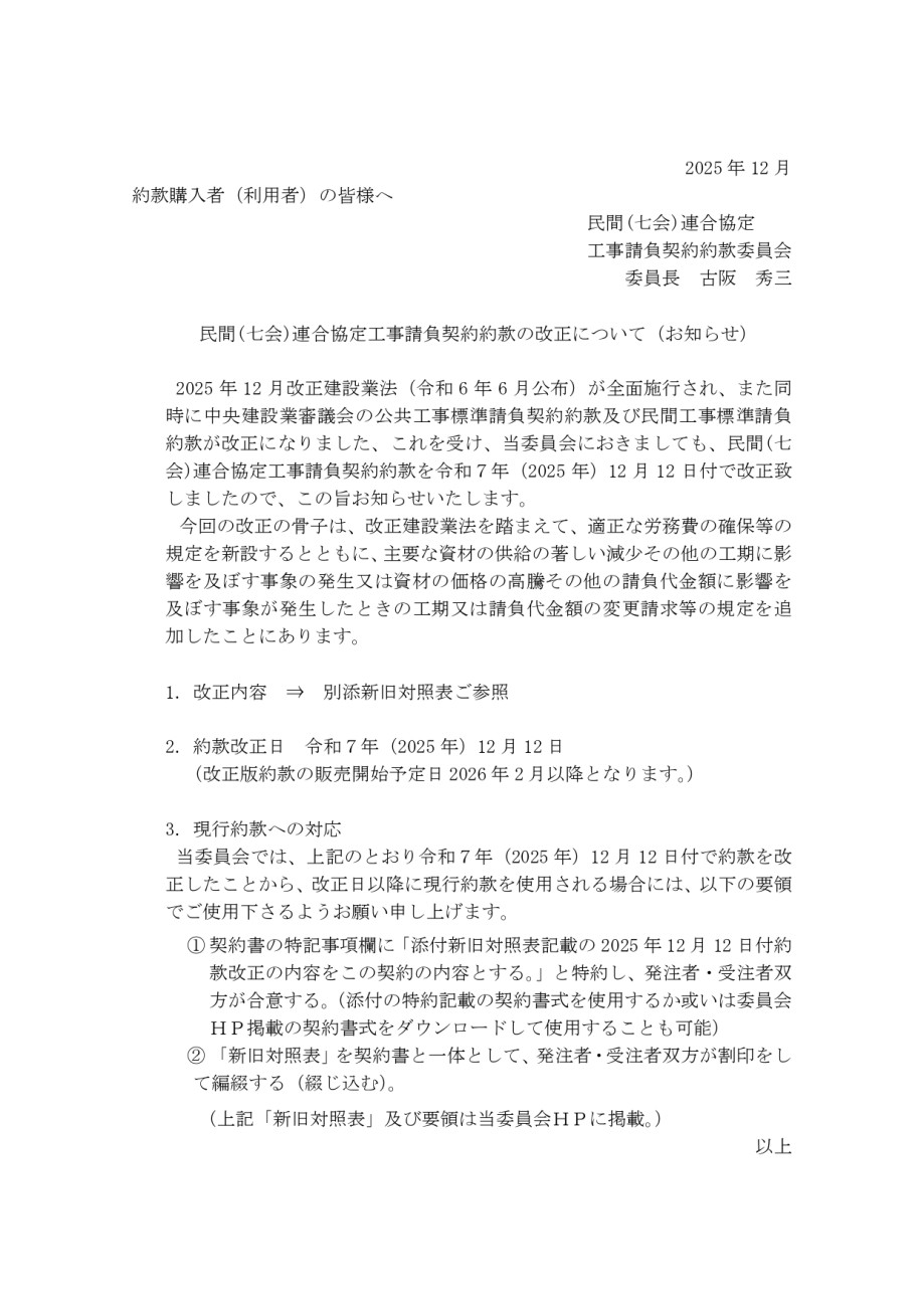 民間(七会)連合協定工事請負契約約款2025年12月改正について