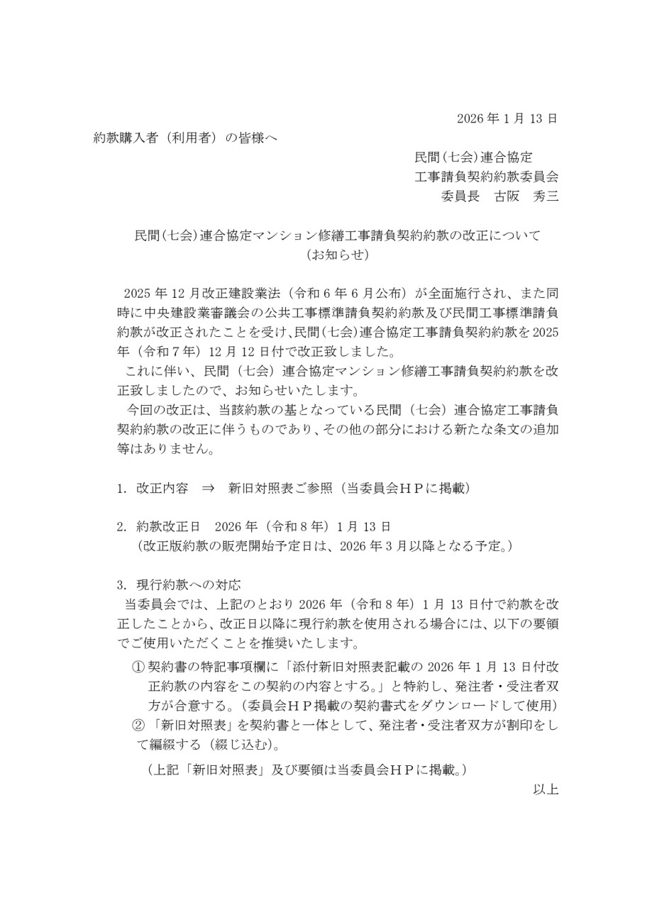 民間(七会)連合協定マンション修繕工事請負契約約款の改正について (R7年1月)